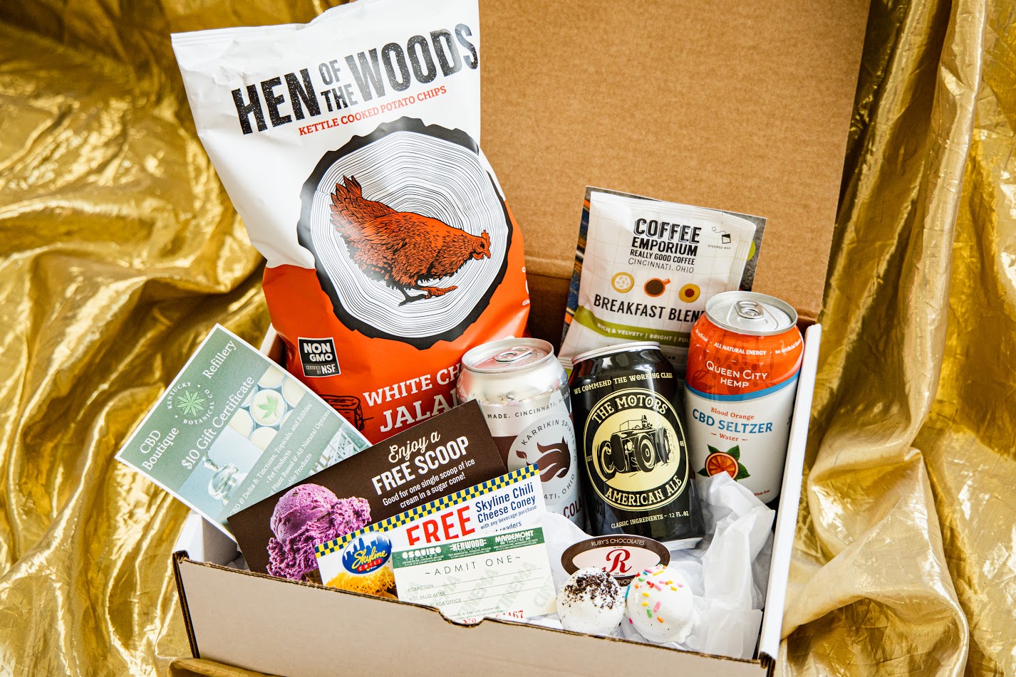 Motor Brewing American Ale | Karrikin Spirits Rum & Cola OR Strawberry Jalapeño Margarita | Queen City Hemp CBS Seltzer | Coffee Emporium Coffee | Hen of the Woods Chips | Ruby's Chocolate's Birthday Cake & Cookies and Cream Mini Truffles | $5 Eli's BBQ Gift Card | $5 Izzy's Gift Card | $25 Gift Card to Local Cincinnati Restaurant | $10 off coupon at KY Botanical Co. | $10 off coupon at Adrian Durban | Coupon for Free Scoop at Graeter's Ice Cream | Coupon for Free Skyline Chili Cheese Coney | Coupon for Free Cookie at BonBonerie | One Ticket to Esquire/Kenwood/Mariemont Theatre | 50% off Tide Cleaners & Free Tide Pod Sample | Keystone Koozie | & MORE