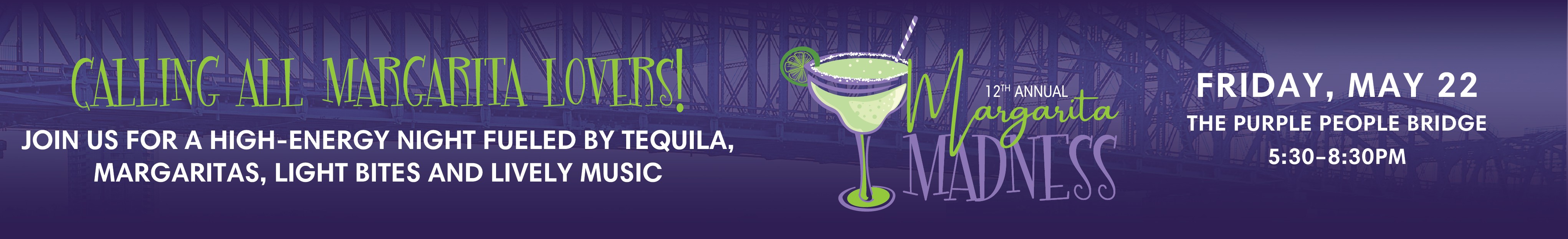 The 12th Annual Margarita Madness event has been announced for Friday May 22, 2026 — a high-energy night fueled by tequila, DJ spinning, and spectacular views. Join us on the Purple People Bridge for margaritas and light bites from the city’s top bars and restaurants. Best of all, you’ll get to cast your ballot for the People’s Choice Best Margarita — and no matter who wins, you’ll be winning!